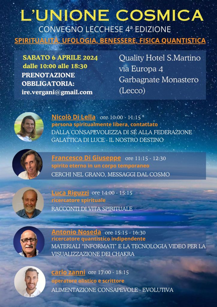Ho avuto l’incredibile opportunità di partecipare al convegno “L’Unione Cosmica” a Lecco, un evento ricco di interventi su temi come spiritualità, ufologia, benessere e fisica quantistica. Ogni relatore ha condiviso con passione le proprie conoscenze, portando alla luce nuove rivelazioni e avanzamenti in campi tanto diversi quanto affascinanti. La possibilità di essere tra i pochi a concludere la giornata con una cena esclusiva in compagnia dei relatori è stata la ciliegina sulla torta. In una sala affollata di partecipanti, avere la possibilità di partecipare a un un momento così ristretto e personale ha reso l’esperienza ancora più preziosa. La serata ha permesso approfondimenti unici e lo scambio di idee in un ambiente intimo, contribuendo a un arricchimento personale che va oltre la semplice acquisizione di nuove informazioni. Sono profondamente grato per le conversazioni avute e per le conoscenze condivise, che hanno lasciato un segno indelebile nel mio percorso di crescita personale e spirituale.